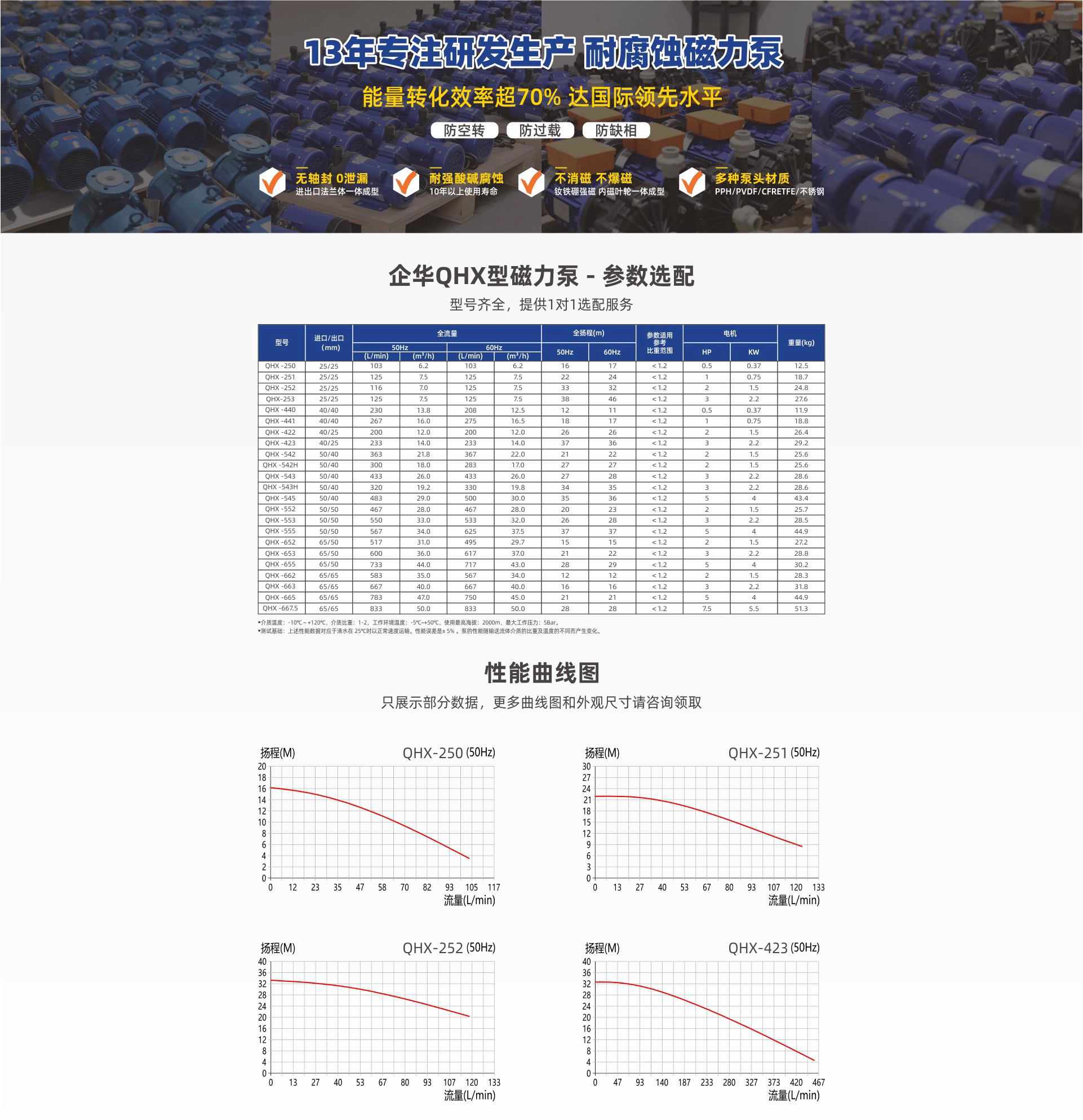 耐強腐蝕,進出口法蘭一體成型專利滴水不漏;采用欽鐵硼高效強磁不消磁,內磁葉輪體成型不爆磁;多種泵頭材質、流量大震動小、噪音低,可另配“智能三防保護裝置”,拒絕空轉損壞。